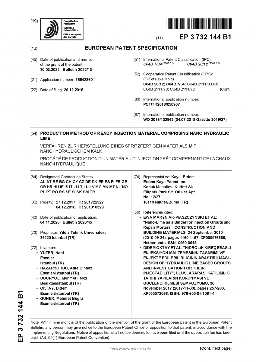 İnşaat Mühendisliği Bölümü Öğretim Üyelerimizden Prof.Dr. Nabi YÜZER ve Dr.Öğretim Üyesi Didem OKTAY, Kimya-Metalurji Fakültesi'nden Prof.Dr.Afife Binnaz HAZAR YORUÇ, Mimarlık Fakültesi'nden Dr. Öğretim Üyesi Mehmet Fevzi UĞURYOL ve üniversitemiz mezunlarından Dr. Buğra GÜNER ile birlikte "PRODUCTION METHOD OF READY INJECTION MATERIAL COMPRISING NANO HYDRAULIC LIME" buluşu kapsamında Avrupa Patent başvurusu tescil edilmiş ve Avrupa Patent bülteninde yayına çıkmıştır.
